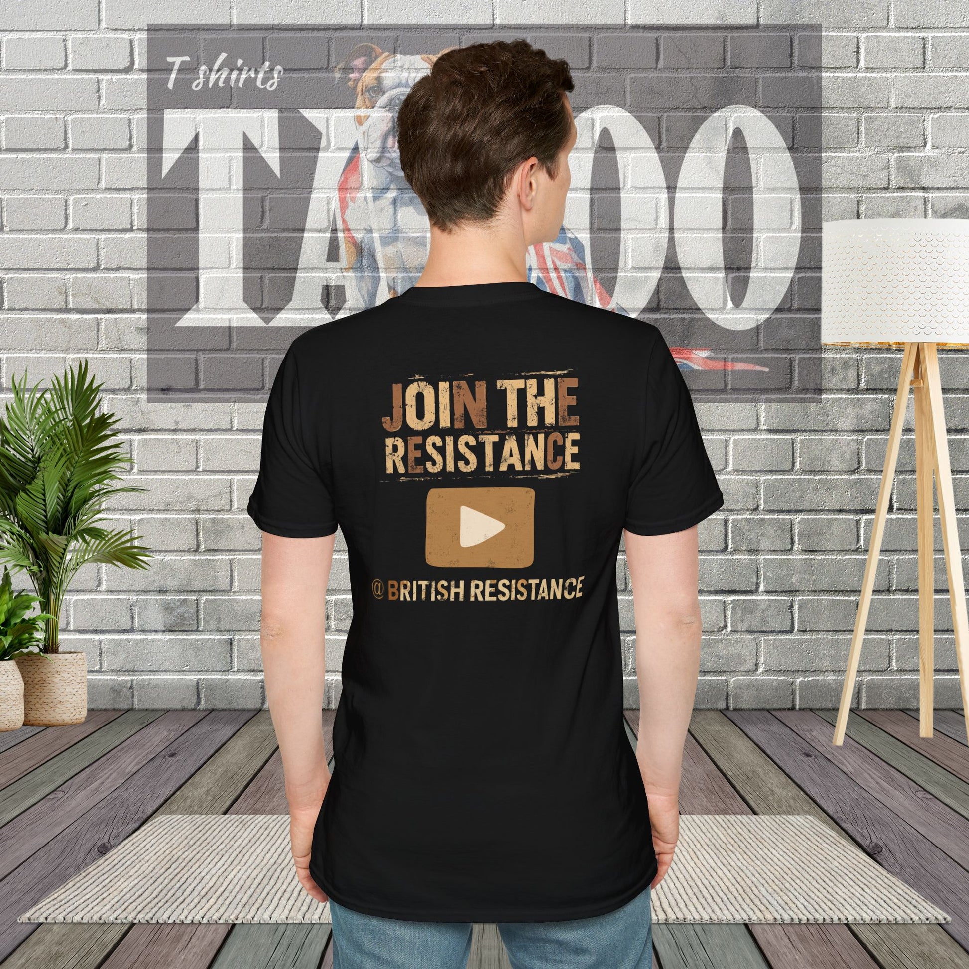 Back Design: Features the slogan Join the Resistance again, with a vintage styled play button and @BritishResistance