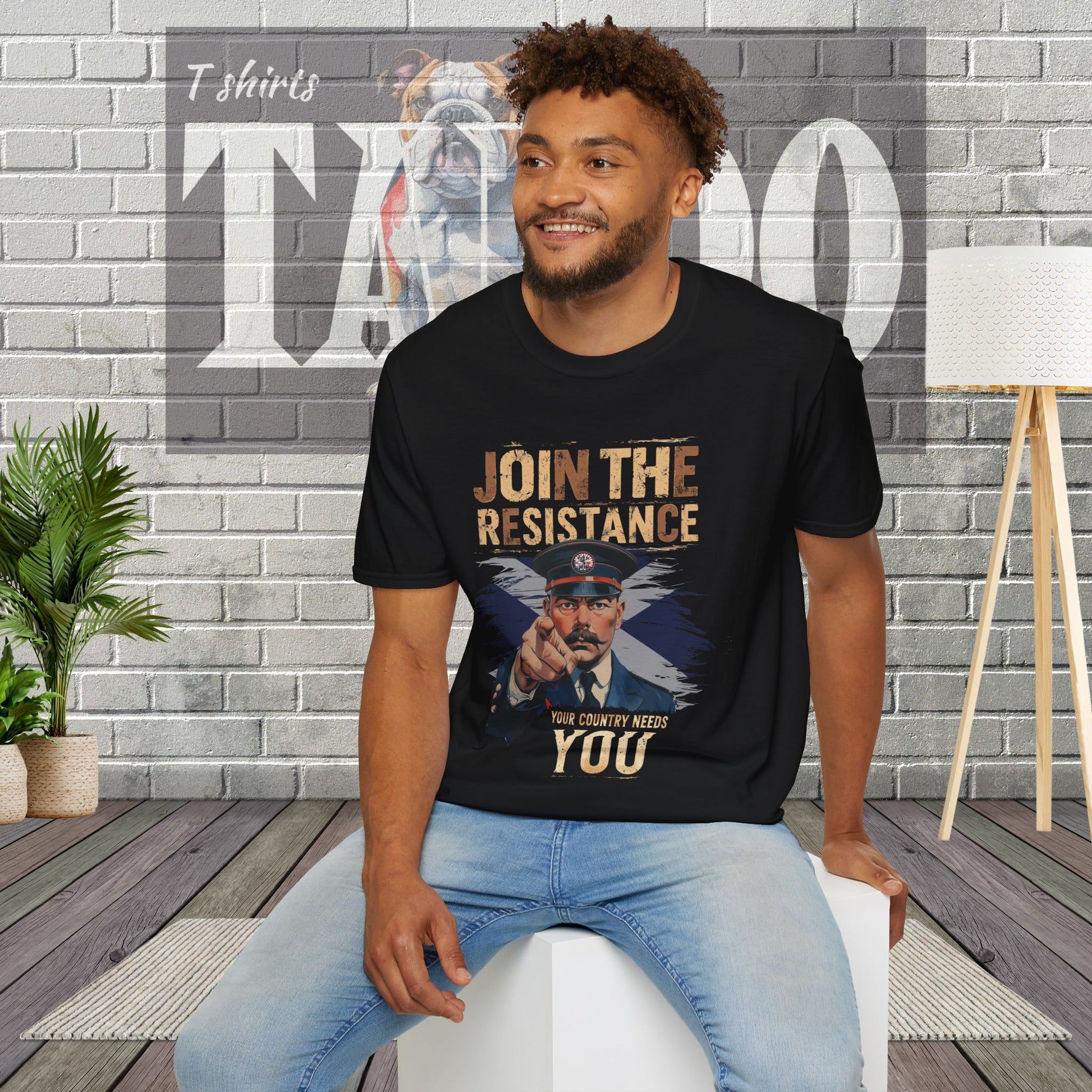 Front Design: Features the classic WW1 recruitment officer pointing directly at the viewer, set against a distressed Scotland Flag backdrop. The powerful slogan ‘Join the Resistance – Your Country Needs You’ is emblazoned above and below, creating a striking call-to-action with vintage grit and modern patriotic flair.